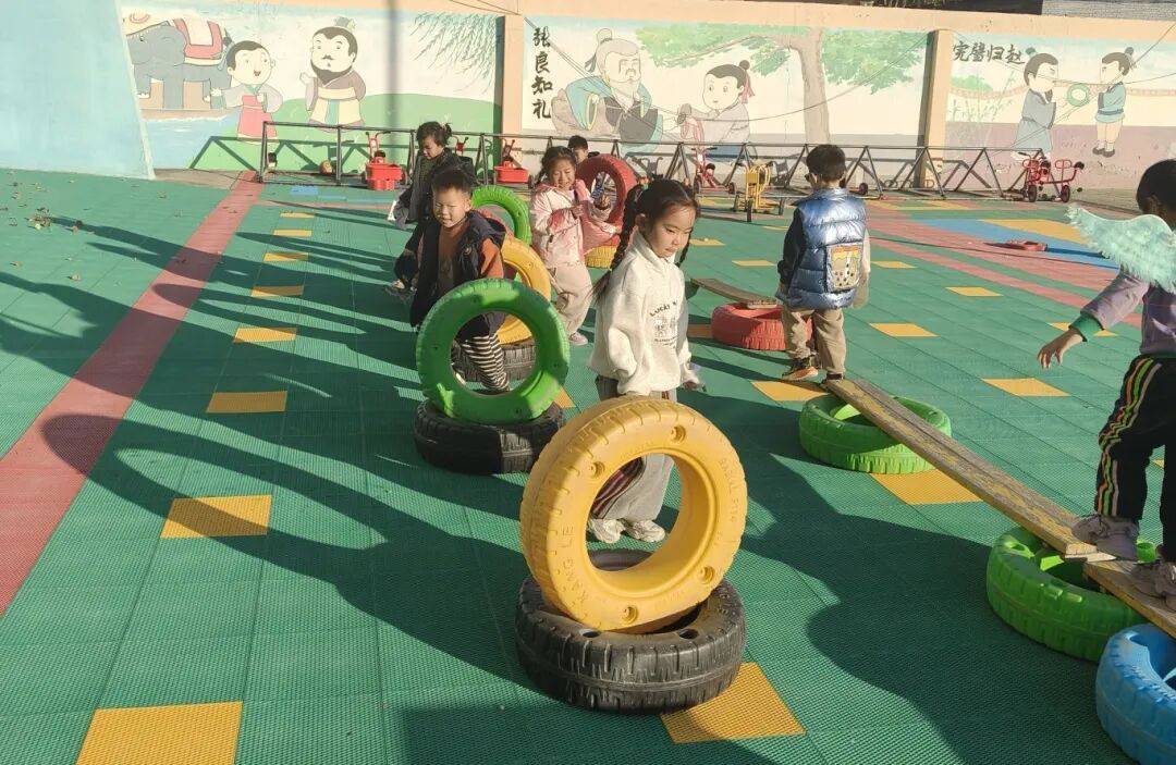 活动现场,口号声此起彼伏:“伸伸臂、弯弯腰,蹦蹦跳跳身体好!”。高岭幼儿园教师充分结合农村自然资源优势,精心设计了“跳房子”“轮胎障碍”“猫抓老鼠”等趣味运动项目,孩子们在追逐嬉戏中完成奔跑、跳跃、同学协作等动作,既能活动筋骨又增强体质。这种将自然素材转化为运动器材的做法,既贴合农村幼儿园实际,又充分调动了幼儿参与运动的积极性。