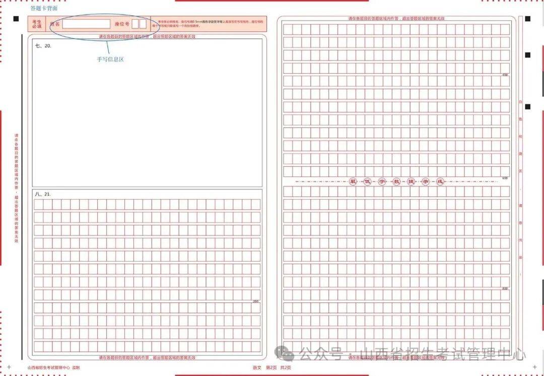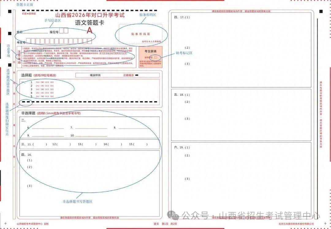 答题卡的格式:答题卡设计采用主客观一体化设计,选择题和非选择题的答题区域全部在同一张答题卡上。英语科目采用A4答题卡,语文、数学科目采用A3答题卡。答题卡分A卡、B卡两种类型。