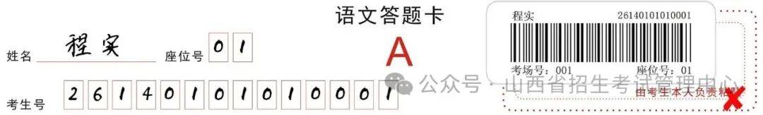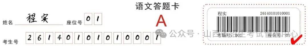 条形码由监考员发给考生,考生应对条形码认真核对,并将其粘贴在答题卡规定的区域内;条形码一律横贴,即条形码中姓名、考生号、考场号、座位号从左向右方向排列,粘贴倾斜度不得超过15度,不可二次粘贴,破损后不予更换;考生在答题的过程中,一定要小心谨慎,切勿污损条形码,要保持条形码的清洁、完整。