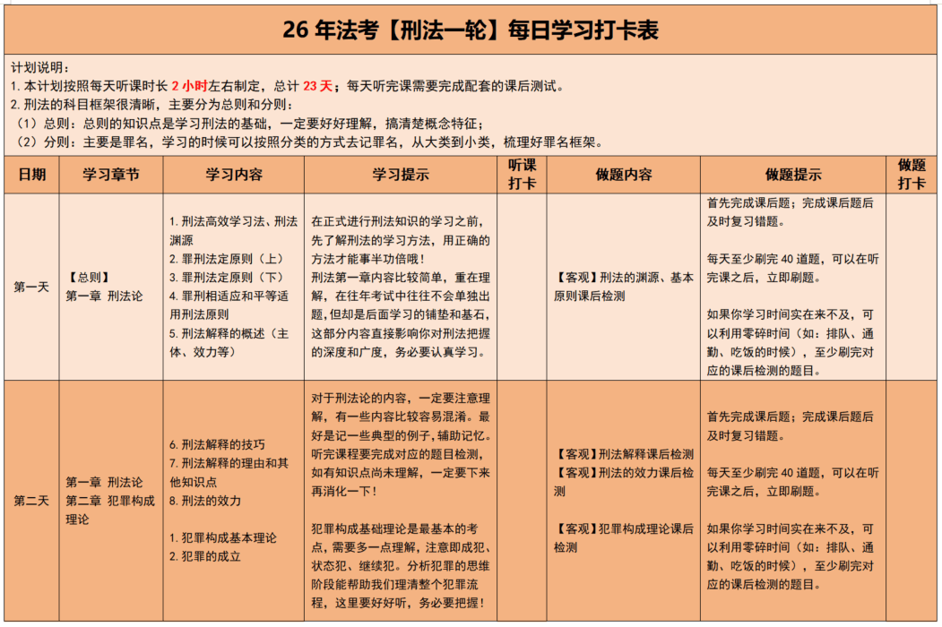 另外,我还配套写了一份“刑法每日学习打卡表(2小时版)”,根据课时情况具体规划每天学几个章节、做几道题目、学习重点提示,帮助大家明确每日目标,快速过完一轮!