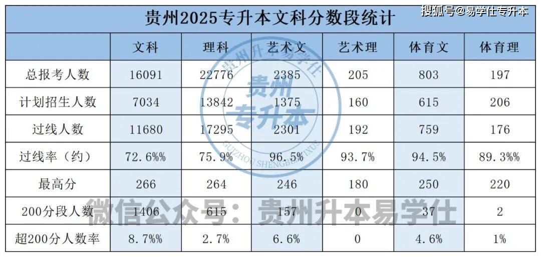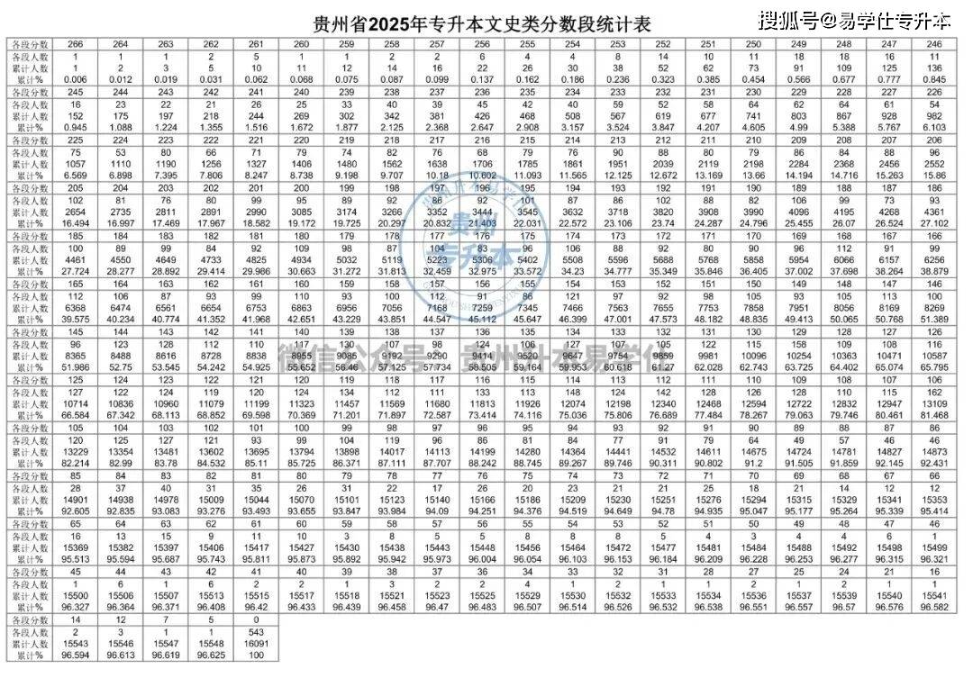 2025年贵州专升本文史类报考人数为16091人,文化课最高分数为266,0分考生人数为543人。
