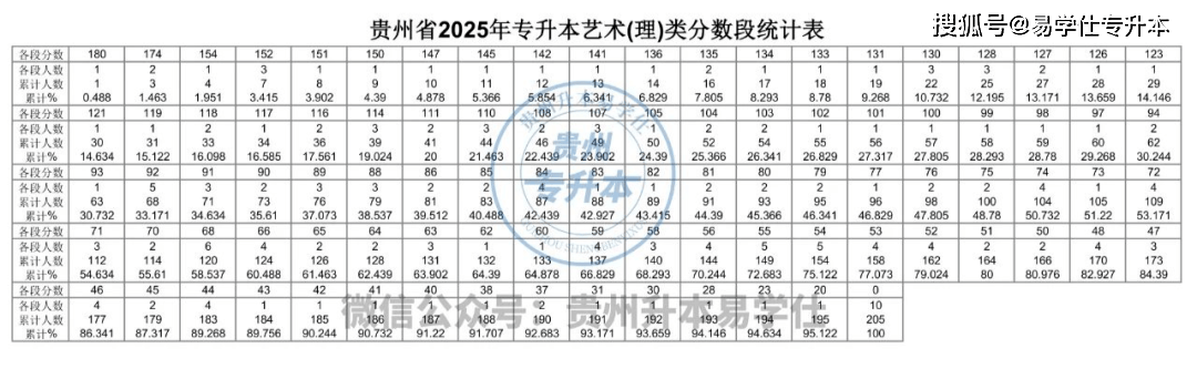 2025年贵州专升本艺术理类报考人数为205人,文化课最高分数为180,0分考生人数为10人。