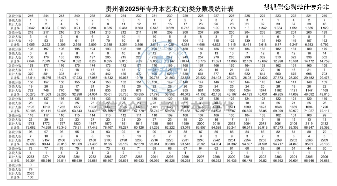 2025年贵州专升本艺术文类报考人数为2385人,文化课最高分数为246,0分考生人数为79人。