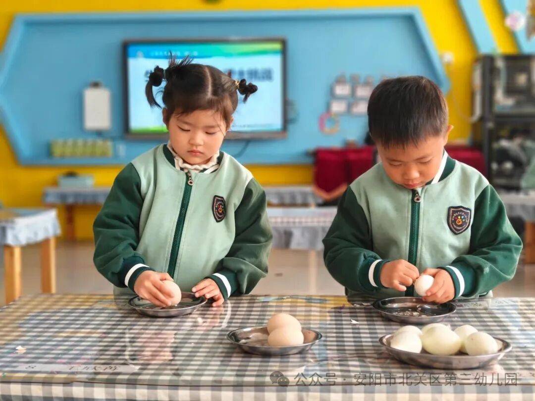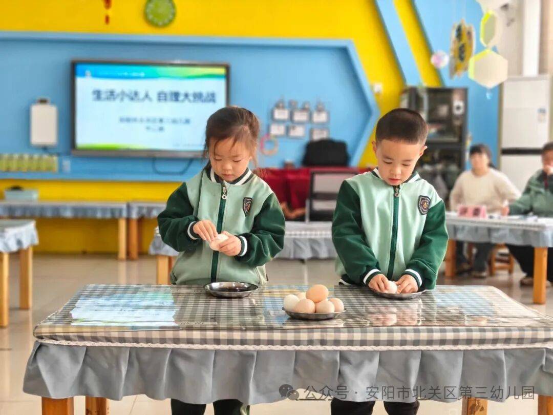 “抱抱臂,弯弯腰,我的衣服叠好了!”清脆的童谣声中,小外套乖乖听话~最精彩的剥鸡蛋环节,孩子们屏息凝神,剥出的鸡蛋光滑完整,脸上写满了“我做到了!”的骄傲。