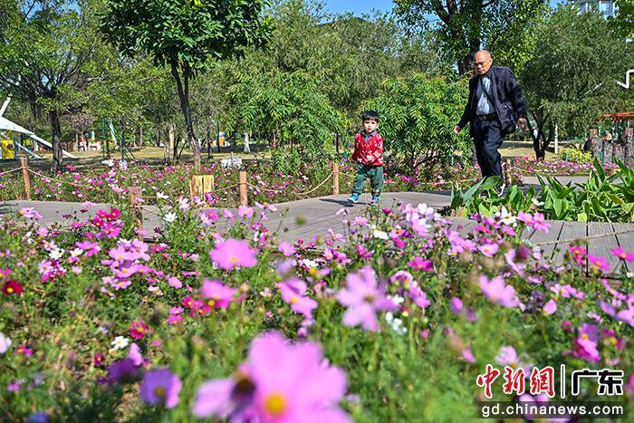 图为老人小孩走在公园步道。步道两侧的花卉正美丽绽放。记者 陈骥旻 摄