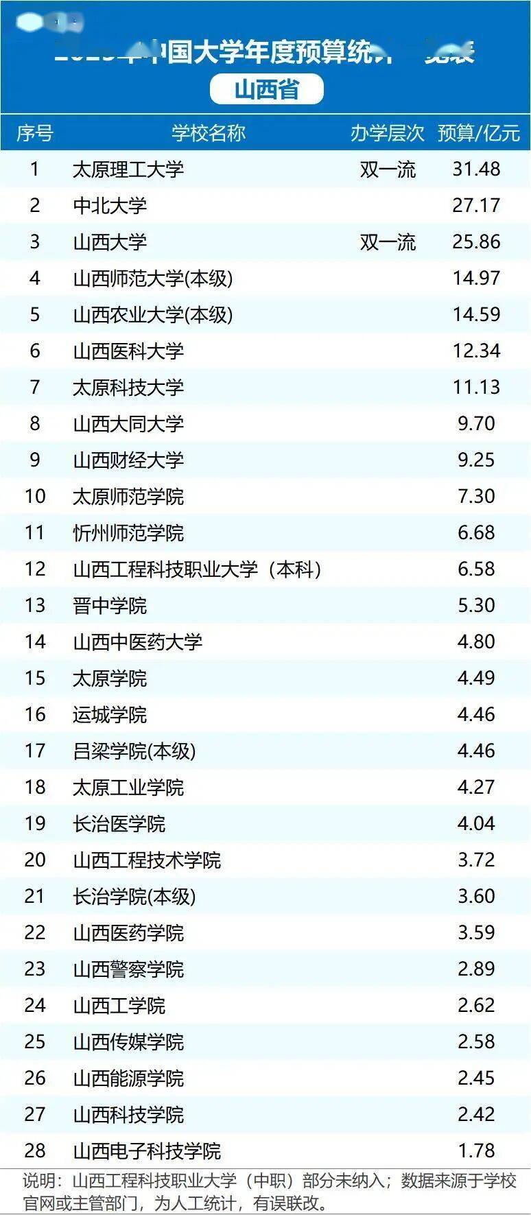 山西省2025年度高校预算统计揭晓,太原理工大学以31.48亿元高居榜首,中北大学27.17亿元、山西大学25.86亿元紧随其后。山西师范大学14.97亿元、山西农业大学14.59亿元、山西医科大学12.34亿元等校预算均显著提升,体现教育投入持续加码。这些资金将优化教学环境、推动科研创新,助力山西高等教育整体跃升,为学生提供更优质的学习资源和实践平台,促进区域人才培育与产业升级。