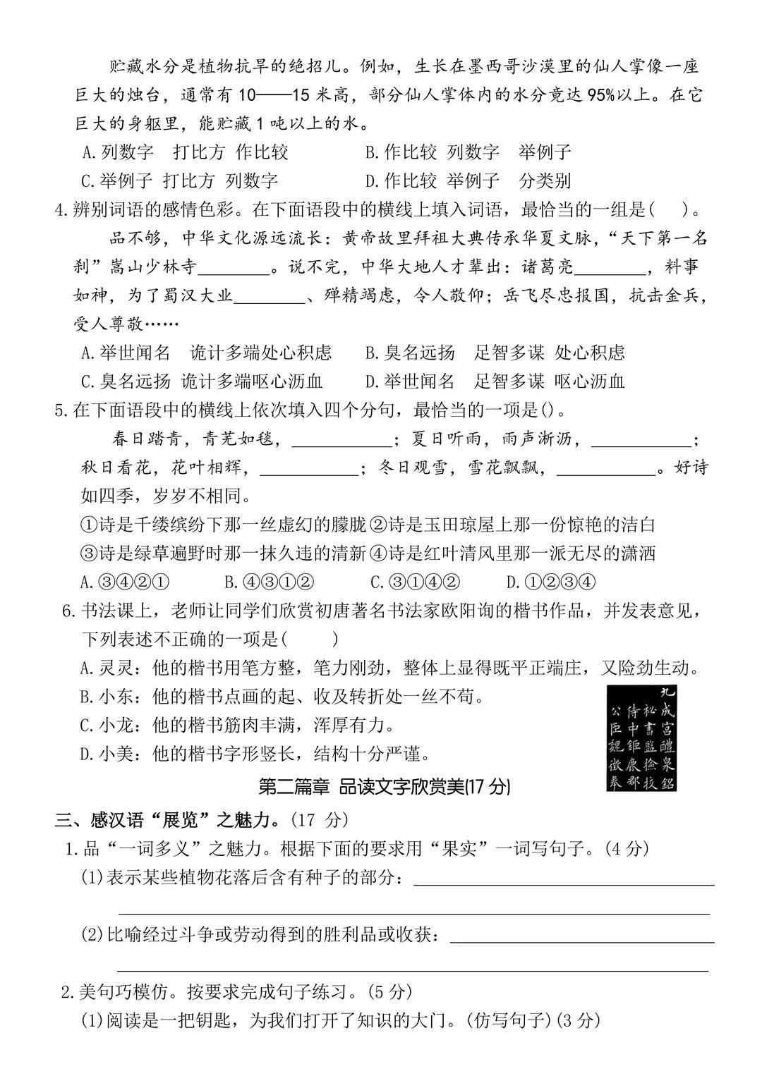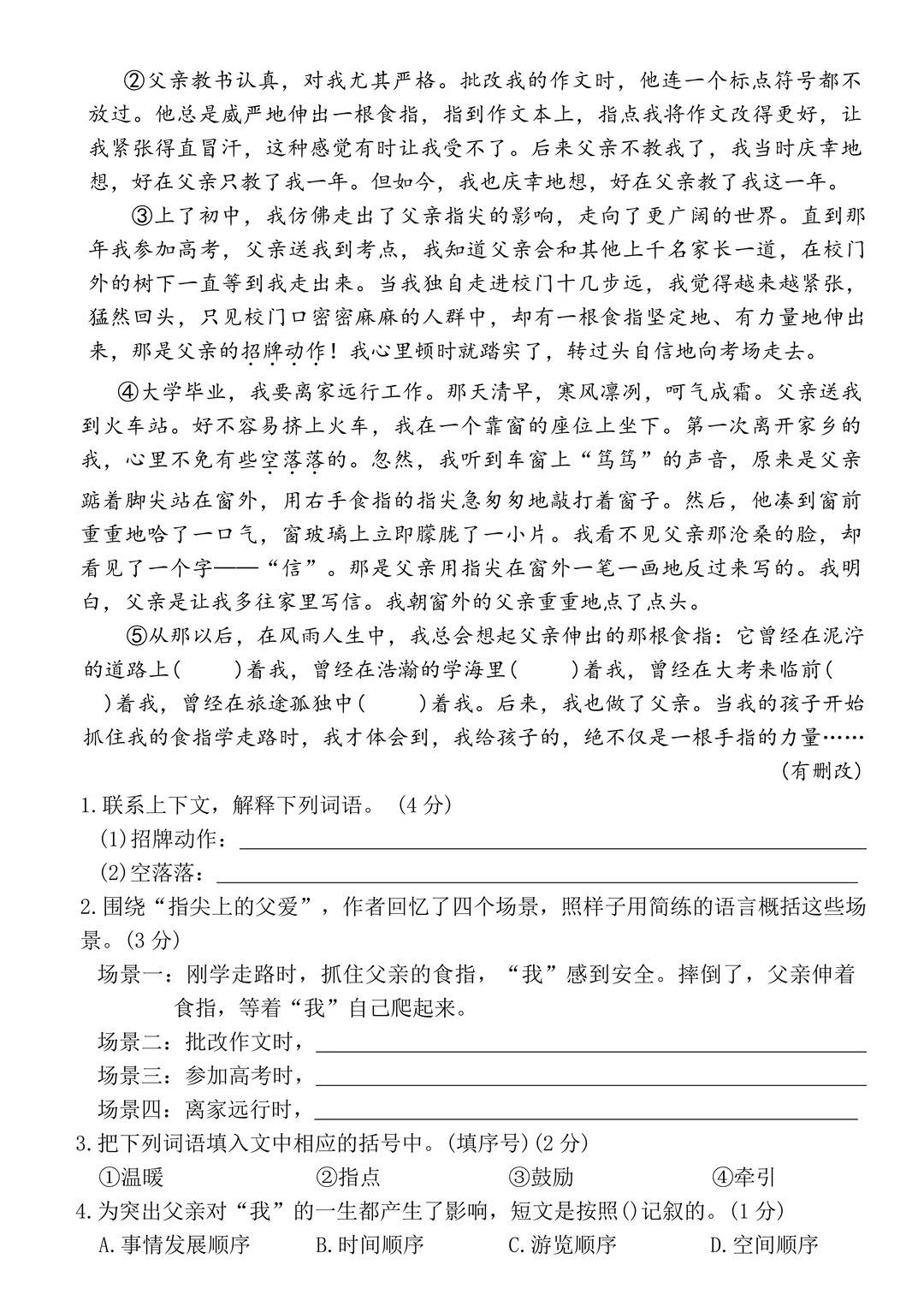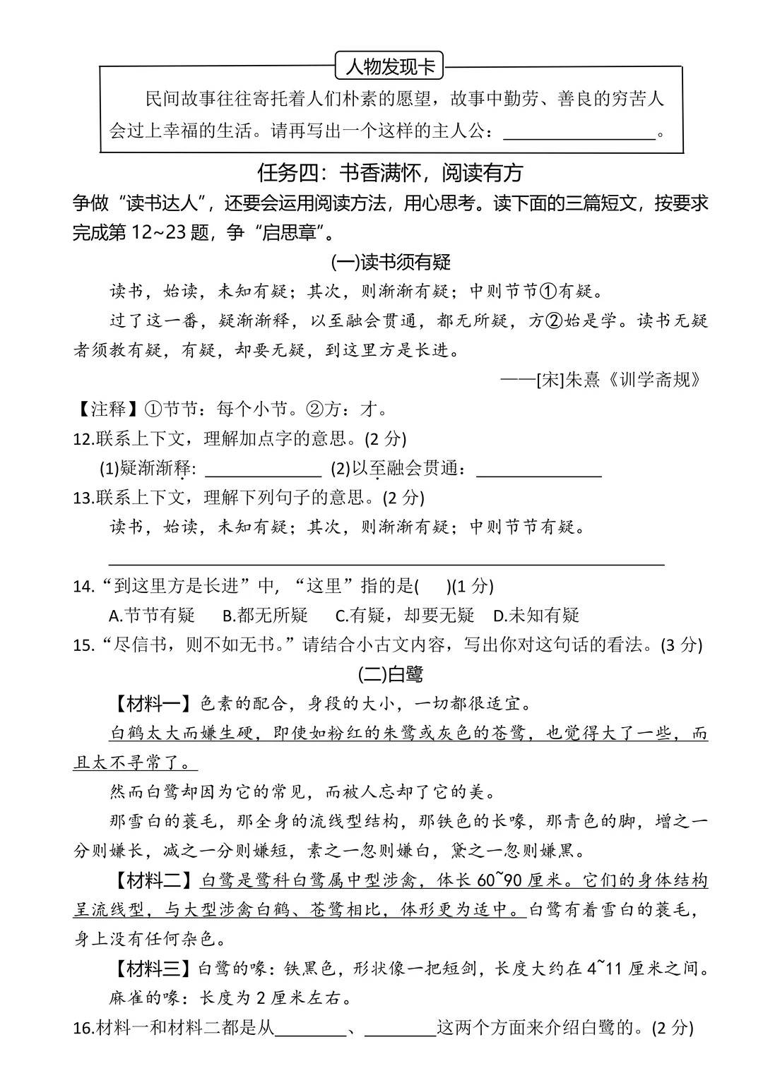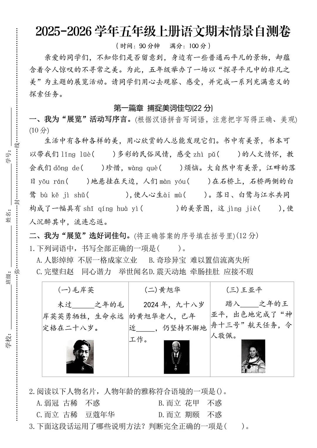 首先是适配五年级 “读写进阶 + 综合应用” 的核心需求—— 五年级是语文从 “基础积累” 向 “读写综合” 过渡的关键期,试卷用 “探寻平凡之美” 的主题串联起字词、阅读、写作,把 “父爱类散文阅读”“‘遇见’主题习作” 融入真实情境,既贴合 “主题式考查” 的趋势,又通过 “任务驱动” 让知识落地,解决了 “会背知识点但不会用” 的问题。