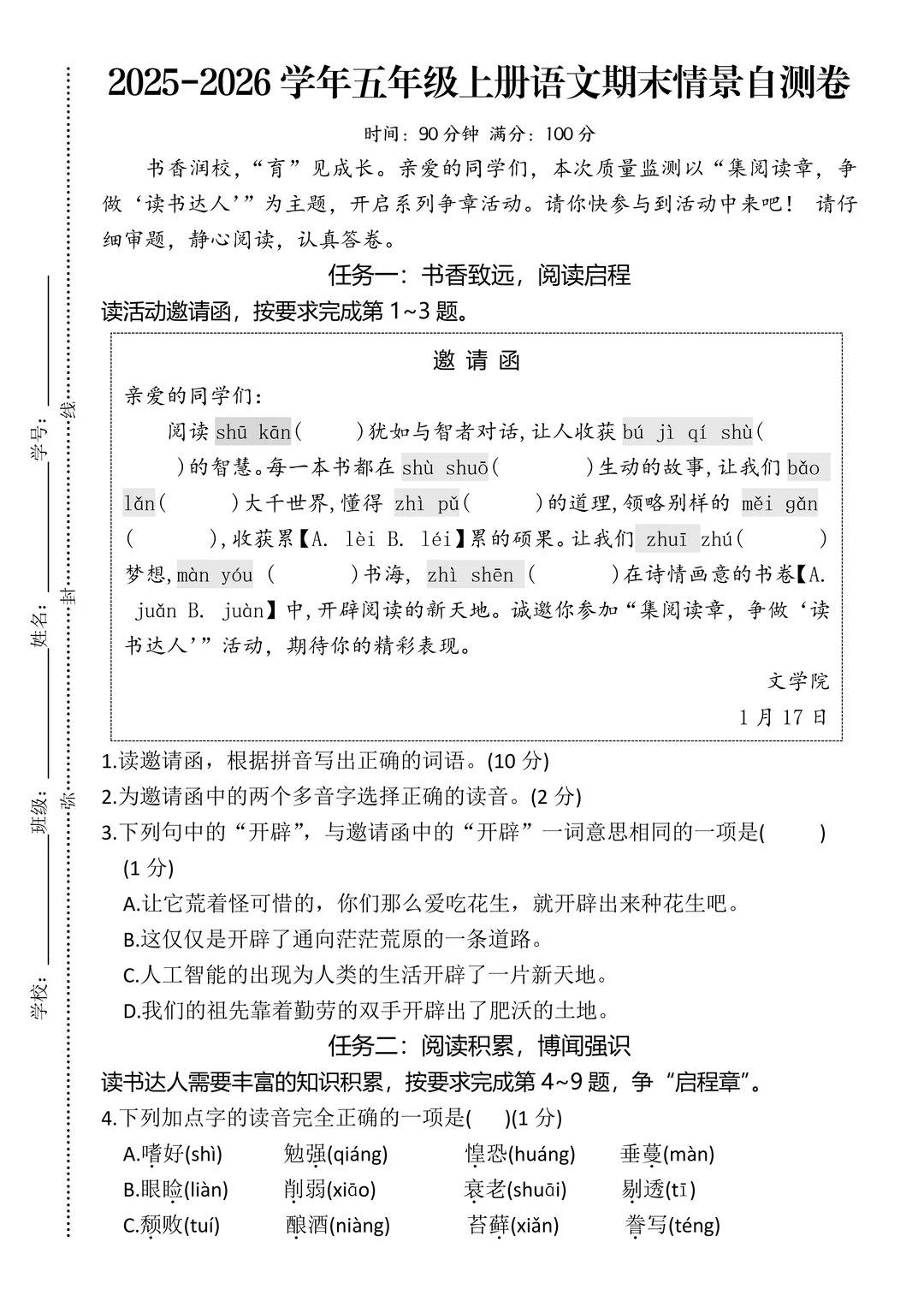 五年级上册语文期末自测卷直接把 “考试” 做成 “主题探究活动”!涵盖字词书写、词语辨析、说明方法判断、阅读理解(父爱主题)、习作(“遇见” 为题),连 “一词多义造句”“美句仿写”“文章推荐理由” 都配了情境任务,从基础积累到读写应用一站式拿捏!