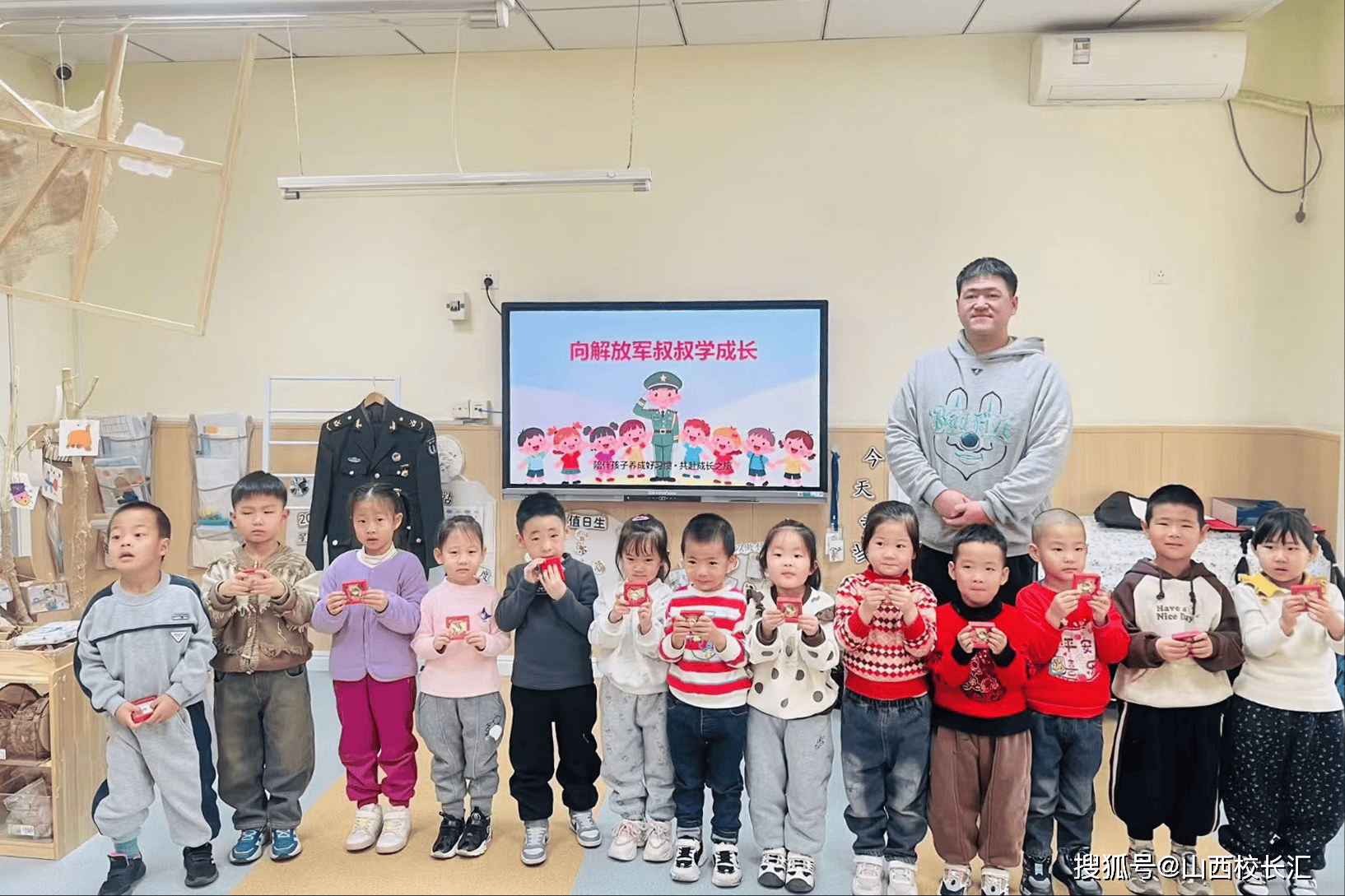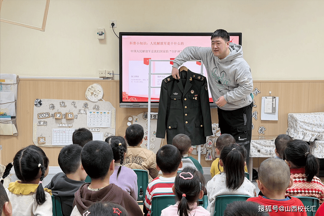 中班的课堂里,品格教育与传统艺术交相辉映。沈培佑爸爸带来“向解放军叔叔学成长”主题课,他用孩子们听得懂的语言讲述解放军勇敢坚守、团结互助的故事,现场示范标准站姿、敬礼姿势,瞬间成为孩子们心中的“超级偶像”。孩子们目不转睛地学习敬礼、列队,在模仿中学会勇敢、懂得坚持,感受军人的责任与荣光。