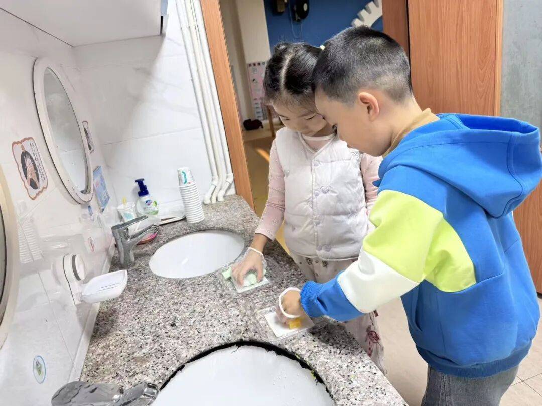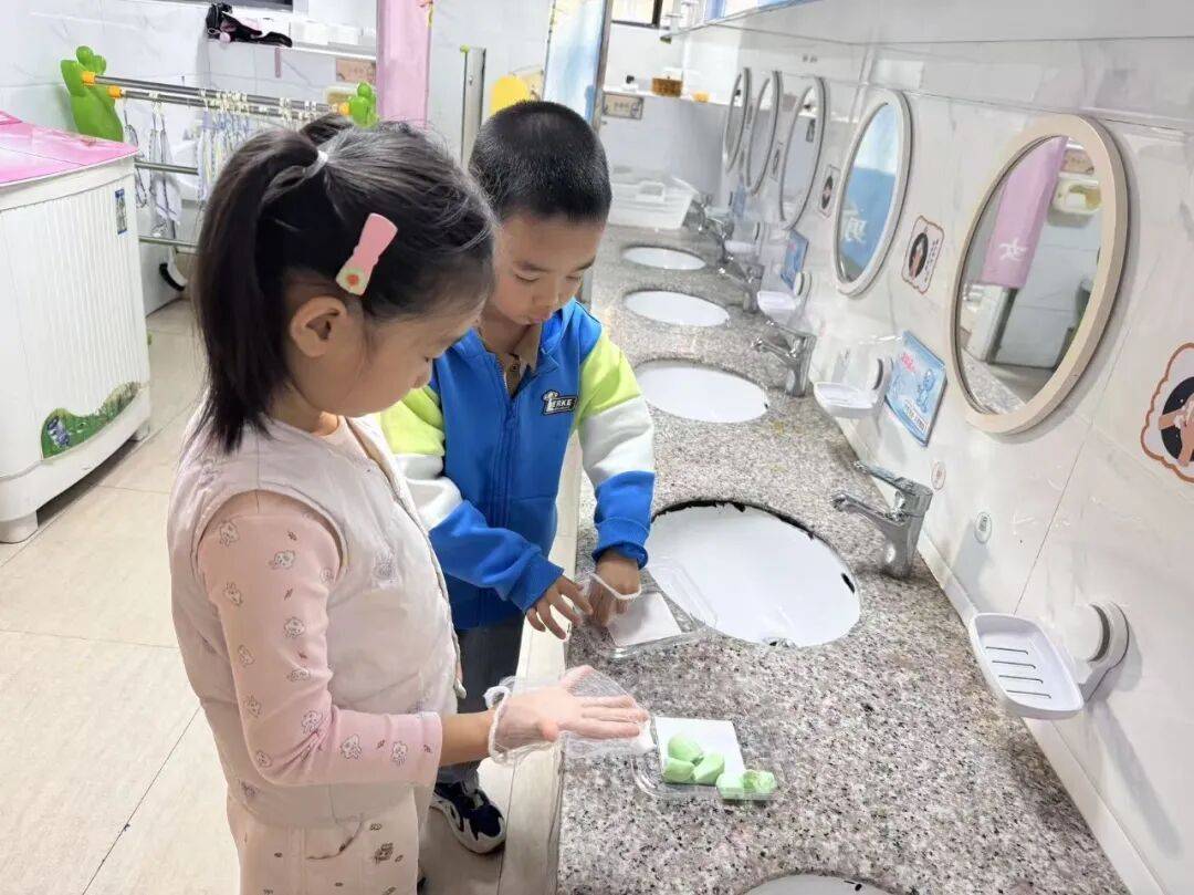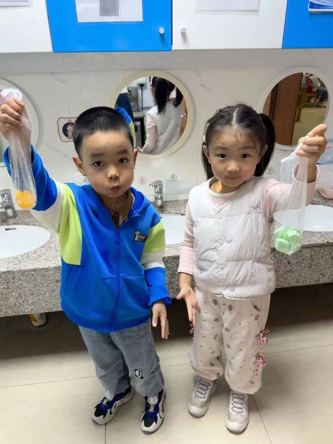 孩子们发现:把小小的肥皂头收集起来,装进网兜里,还可以继续使用,网兜经过揉搓,能加快泡沫的形成。