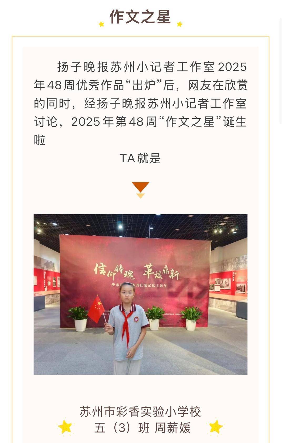 “一双星星般的慧眼,像一支利箭但也可以流出一股暖流。一身绿色的衣服,走起路来像一阵风一样,她就是我的语文李老师,李玲。”苏州市彩香实验小学校五(3)班周薪媛的习作《我的“女侠”老师》,以鲜活笔触勾勒老师形象,用童真视角诉说师生温情,获评48周“作文之星”荣誉称号。
