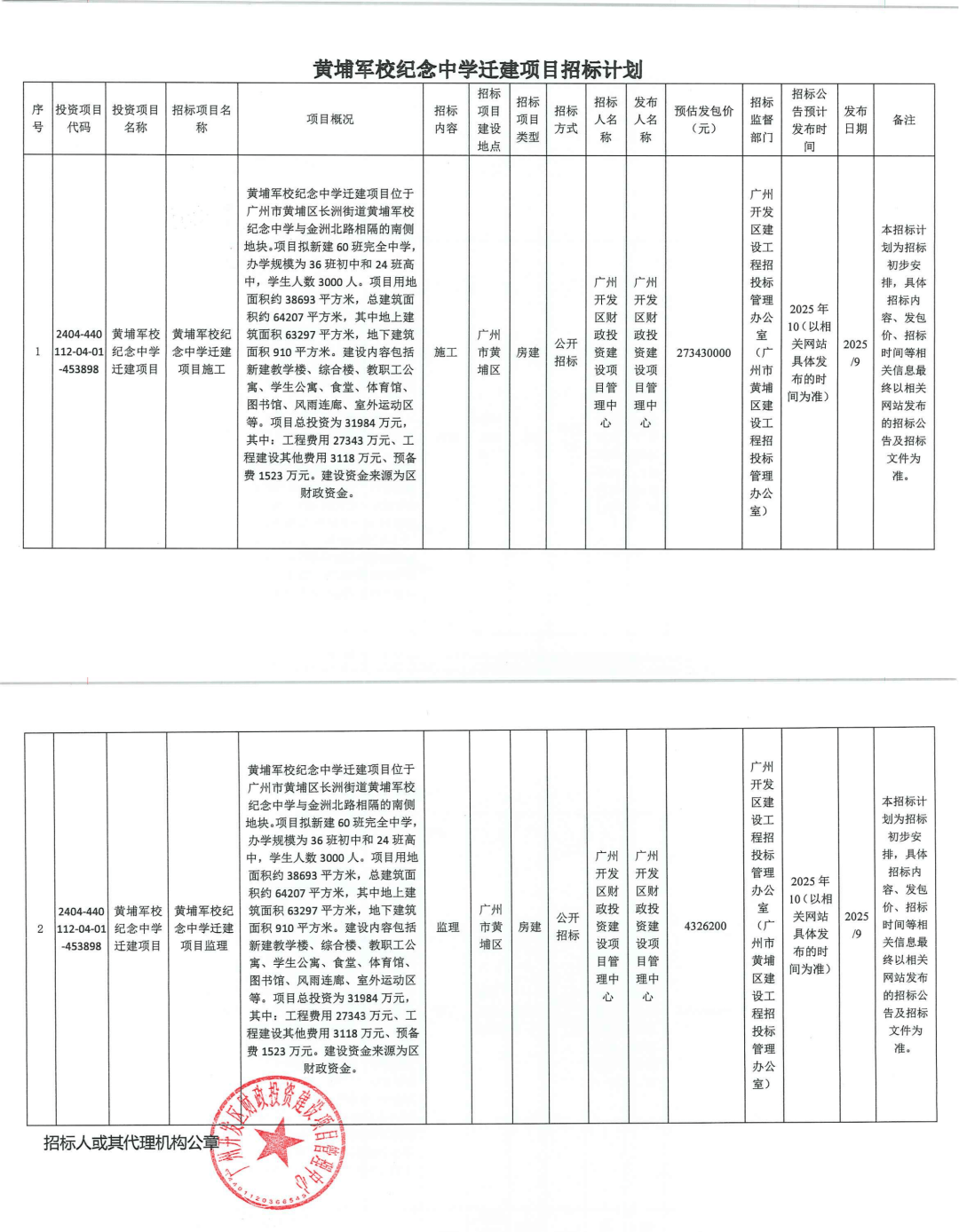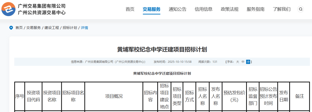 ?10月10日,广州公共资源交易中心发布了黄埔军校纪念中学迁建项目招标计划。