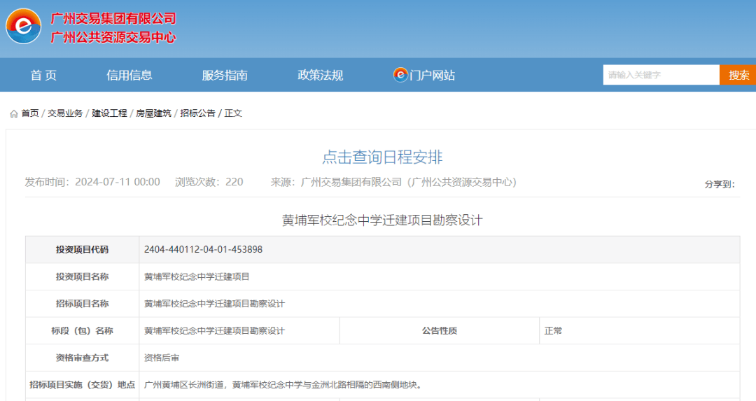 ?2024年7月11日,广州市公共资源交易中心官网发布了黄埔军校纪念中学迁建项目勘察设计招标公告。