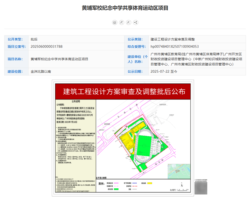 ?7月22日,广州市规划和自然资源局发布了黄埔军校纪念中学共享体育运动区项目的批后公布图。