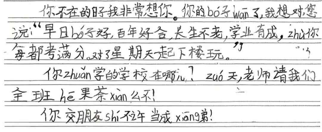 记者在网上看到,小朋友们写的信都不长,有不会写的字就用拼音代替,有些词语的含义他们虽然不明白,但也写在信里表达祝福。很多网友看完了这些信后被感动并表示:“这一刻,我好似明白了纸短情长的真正含义。”