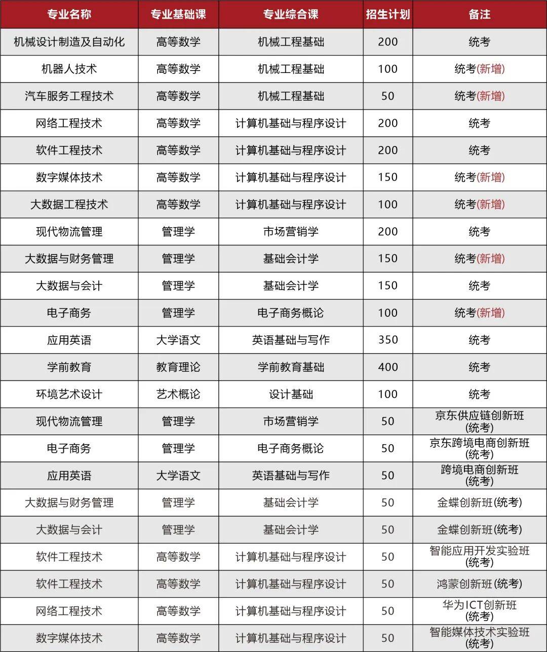 现代物流管理(京东供应链创新班)、电子商务(京东跨境电商创新班)、应用英语(跨境电商创新班)、大数据与财务管理(金蝶创新班)、大数据与会计(金蝶创新班)、软件工程技术(智能应用开发实验班)、软件工程技术(鸿蒙创新班)、网络工程技术(华为ICT创新班)、数字媒体技术(智能媒体技术实验班)。