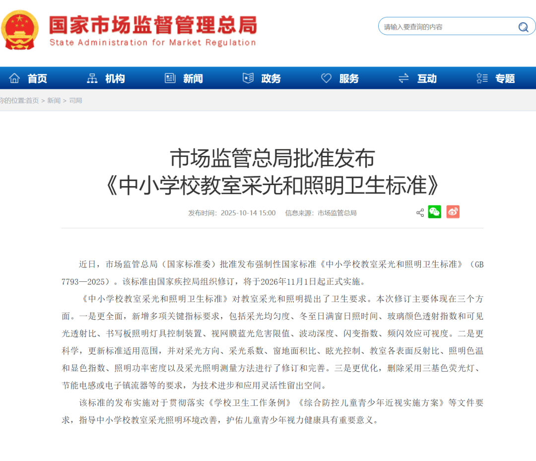 近日,市场监管总局(国家标准委)批准发布强制性国家标准《中小学校教室采光和照明卫生标准》(GB 7793—2025)。该标准由国家疾控局组织修订,将于2026年11月1日起正式实施。