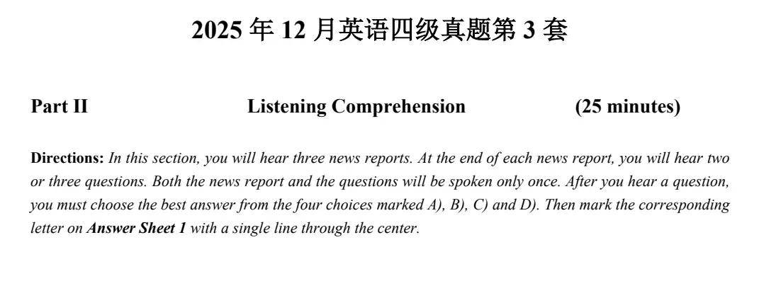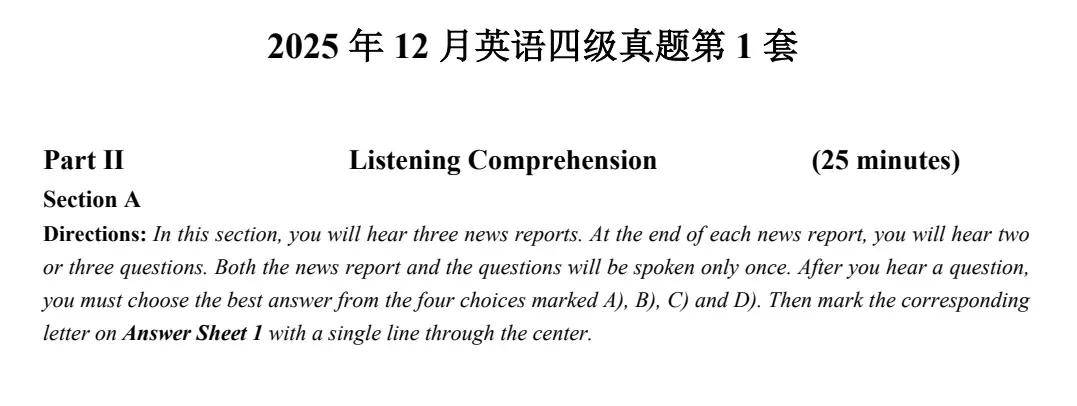 四级真题试卷及答案估分|2025年12月英语四级真题及答案(第一、二、三套全):