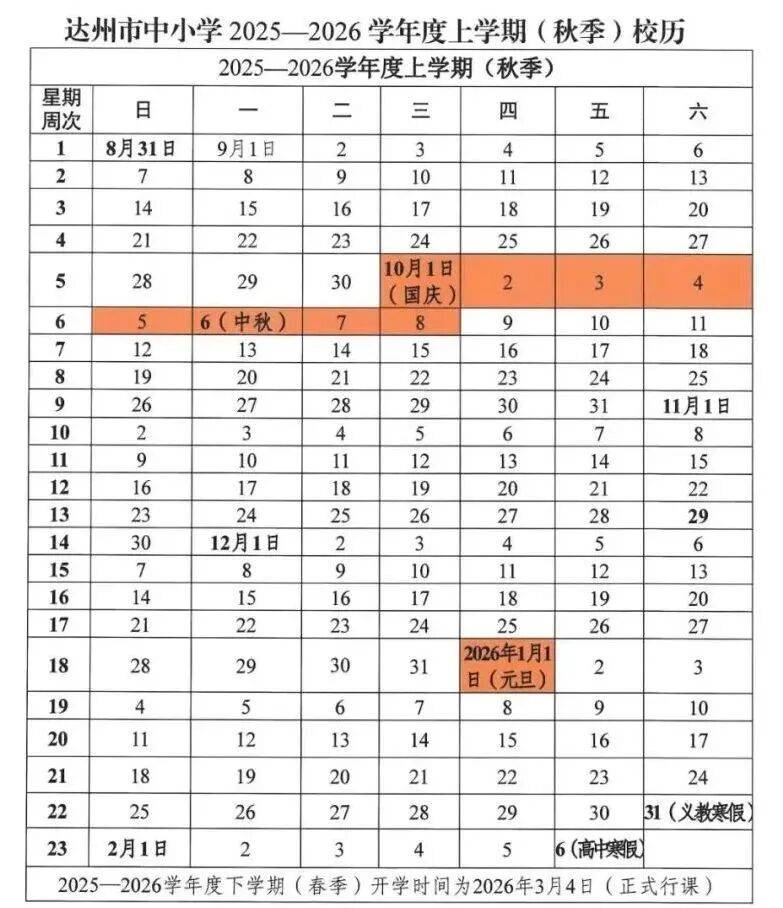 达州市中小学2025-2026学年度上学期(秋季)校历