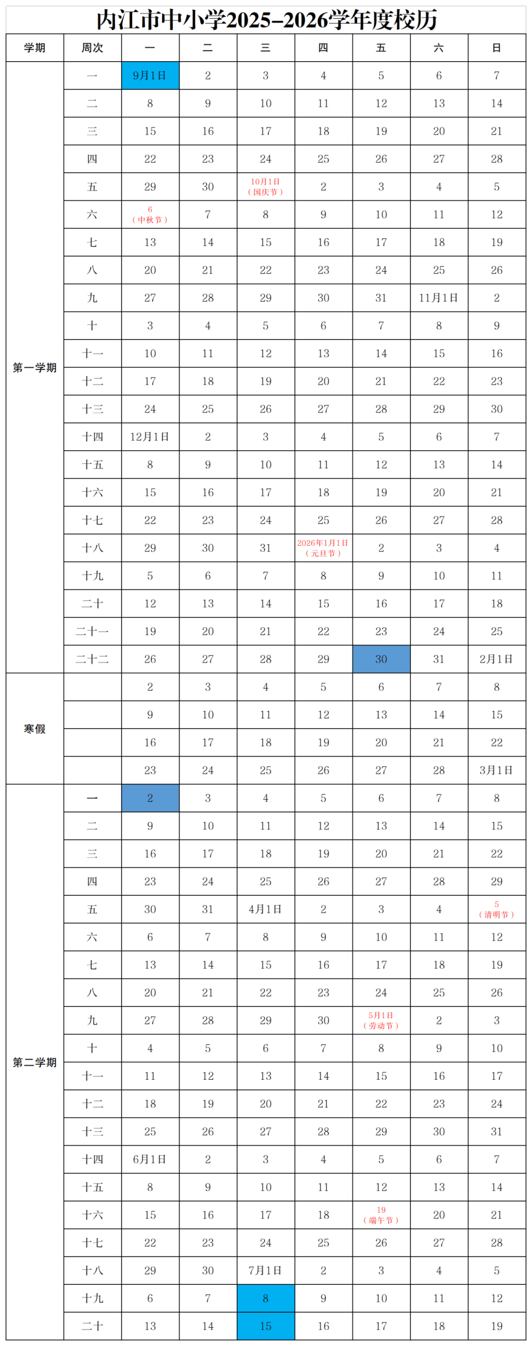 全市中、小学2025—2026学年度第一学期。2025年8月31日报到注册,开展入学教育,9月1日正式行课。2026年1月30日结束,1月31日开始放寒假,2025-2026学年度第二学期。2026年3月1日报到注册。