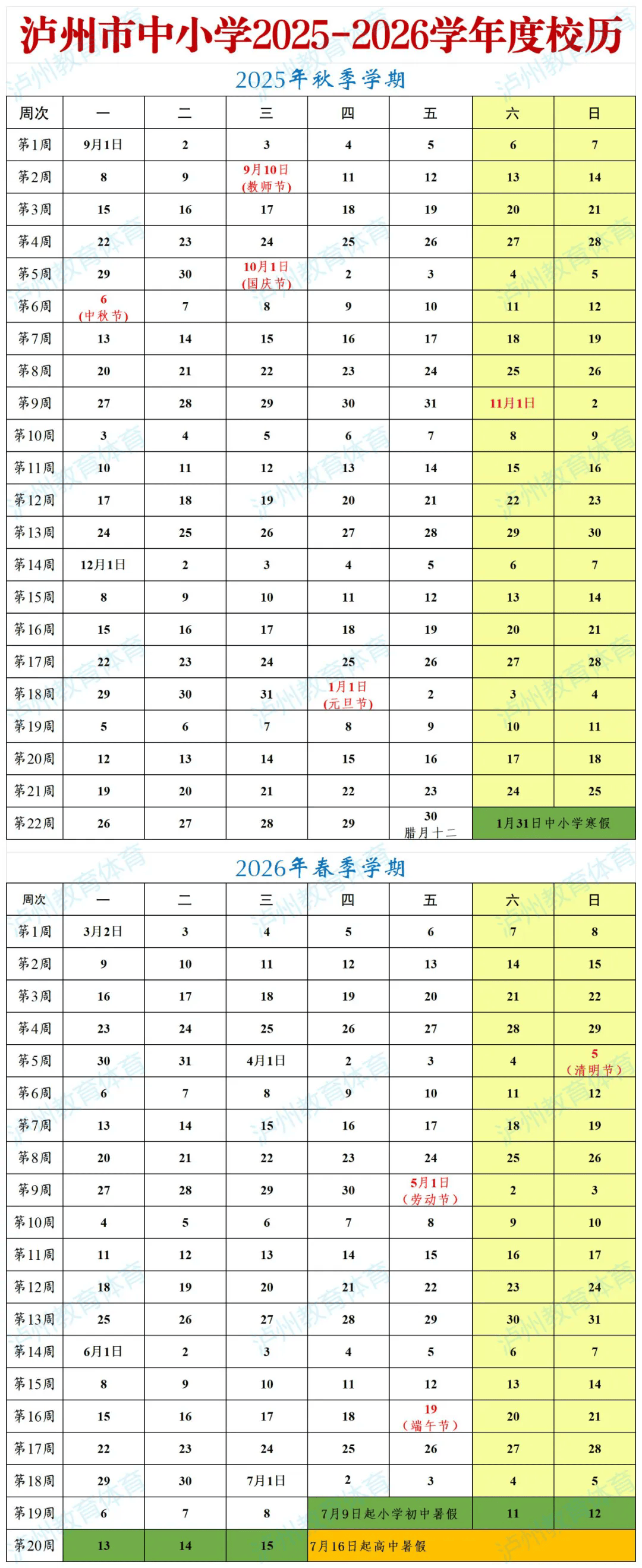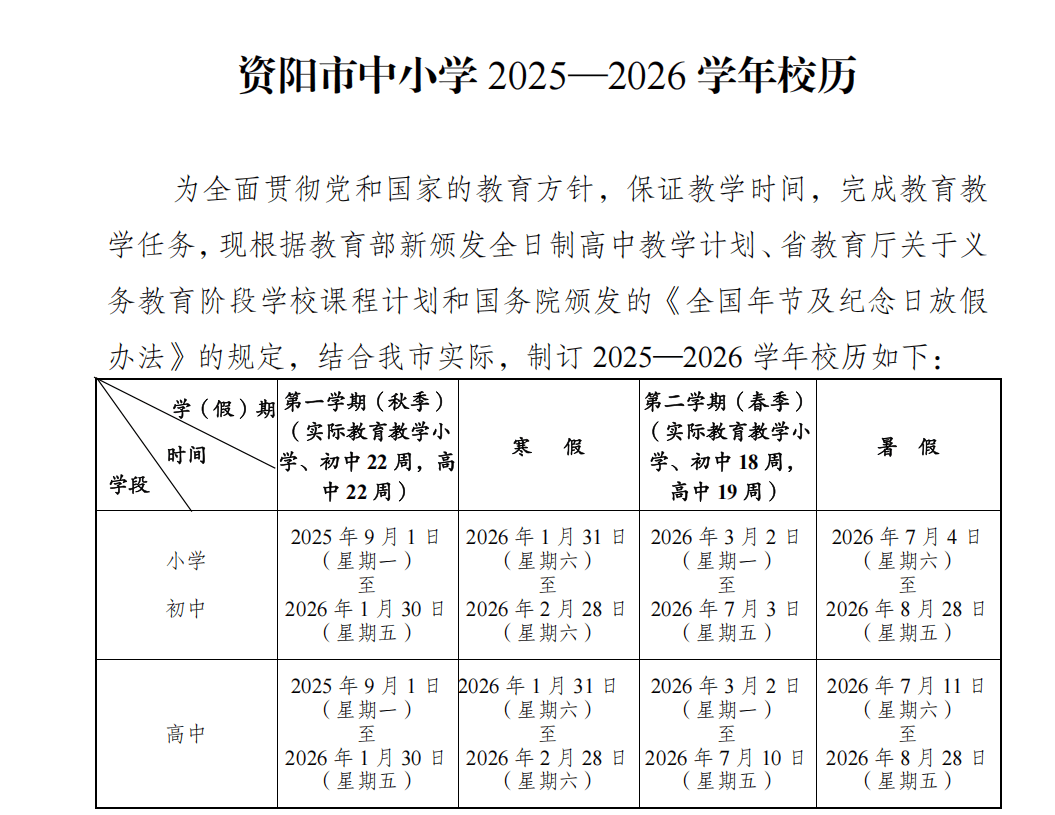 全市中、小学2025—2026学年度(秋季)于2025年8月31日报到,9月1日正式行课。2026年1月31日放寒假;2026年3月1日报到,3月2日正式行课。各幼儿园、中职学校寒暑假及开学时间可参照执行。