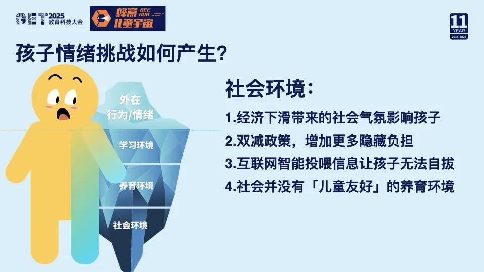 先说社会环境。大人们总说社会发生了什么问题。一个二年级的孩子告诉我,他说:“爸爸妈妈现在压力好大,公司效益不好,每天回家都很晚,还吵架,有时候把脾气发泄到我身上。”没错,经济下行带来的焦虑直接传导给孩子,他成了最后的情绪承受者。
