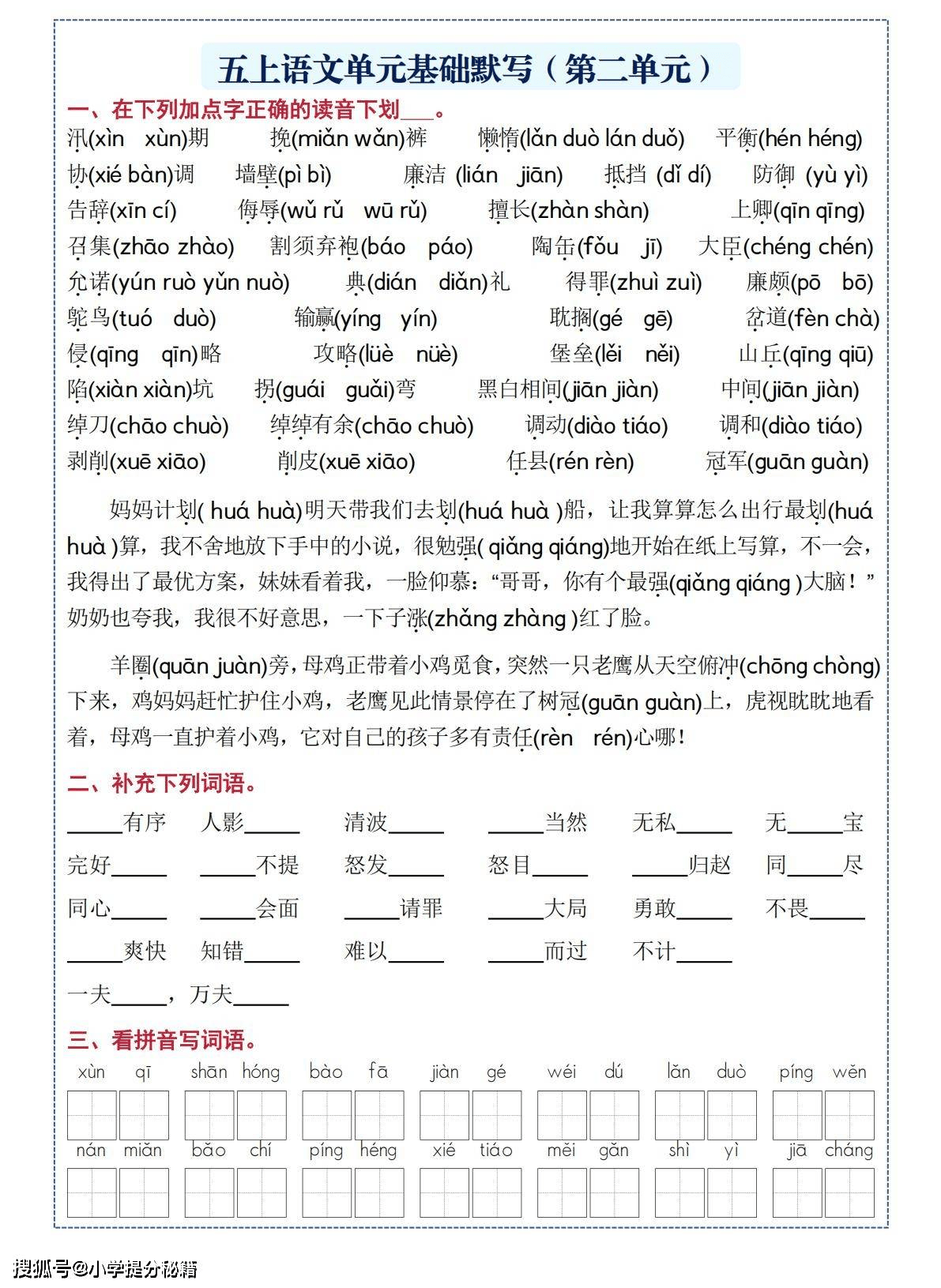 今天为大家分享:五上语文单元基础默写空白版,主要包含三类题型:汉字读音类练习、词语积累类练习、看拼音写词语练习。汉字读音类练习聚焦单元内易读错、多音多义的汉字,比如 “便(方便 / 便宜)”“挑(挑选 / 挑战)” 等多音字的不同读音辨析,以及 “铿锵”“馈赠” 等难读字词的注音;词语积累类练习以补充四字词语为主,涵盖单元课文中的重点成语与短语;看拼音写词语则对应单元要求掌握的生字词,包含 “白鹭”“播种”“辉煌” 等课文核心词汇,部分单元还增加了形近字分组组词的练习,强化字形区分。