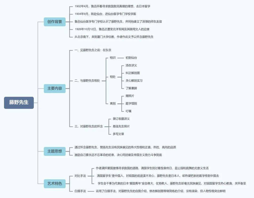 《藤野先生》,是鲁迅于1926年在厦门大学时所写的一篇回忆性散文。作者在文中回忆了在日本仙台医学专门学校的留学生活,表达了深切的怀念之情。另外,文中热烈赞颂藤野严九郎先生辛勤治学、诲人不倦的精神及其严谨踏实的作风,特别是他对中国人民的诚挚友谊。同时,也表现了作者强烈的爱国主义思想以及同帝国主义势力斗争的战斗精神。