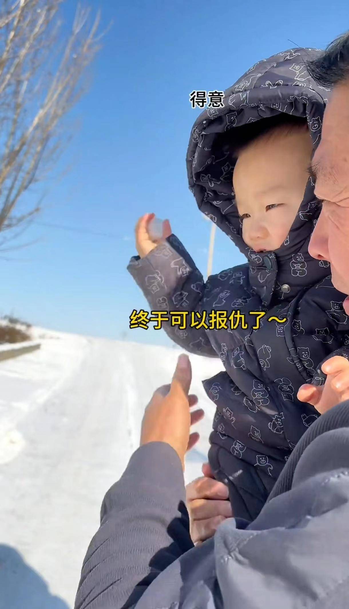 接下来的镜头就是爸爸跟孩子打雪仗,只见爸爸手里抓着一个大雪球,两只手都抱不过来的那种,对着萌娃的身体轻轻扔了过去。