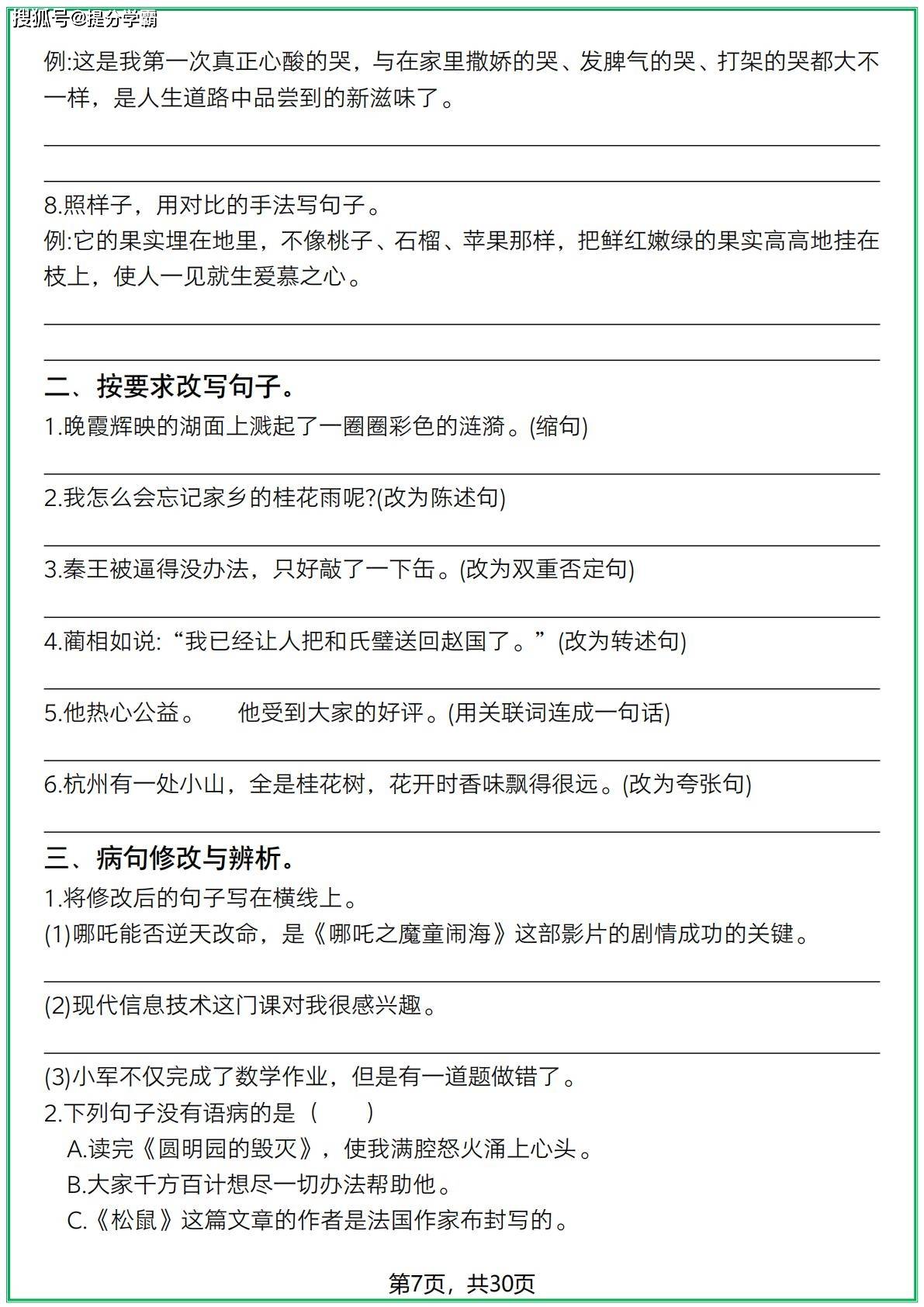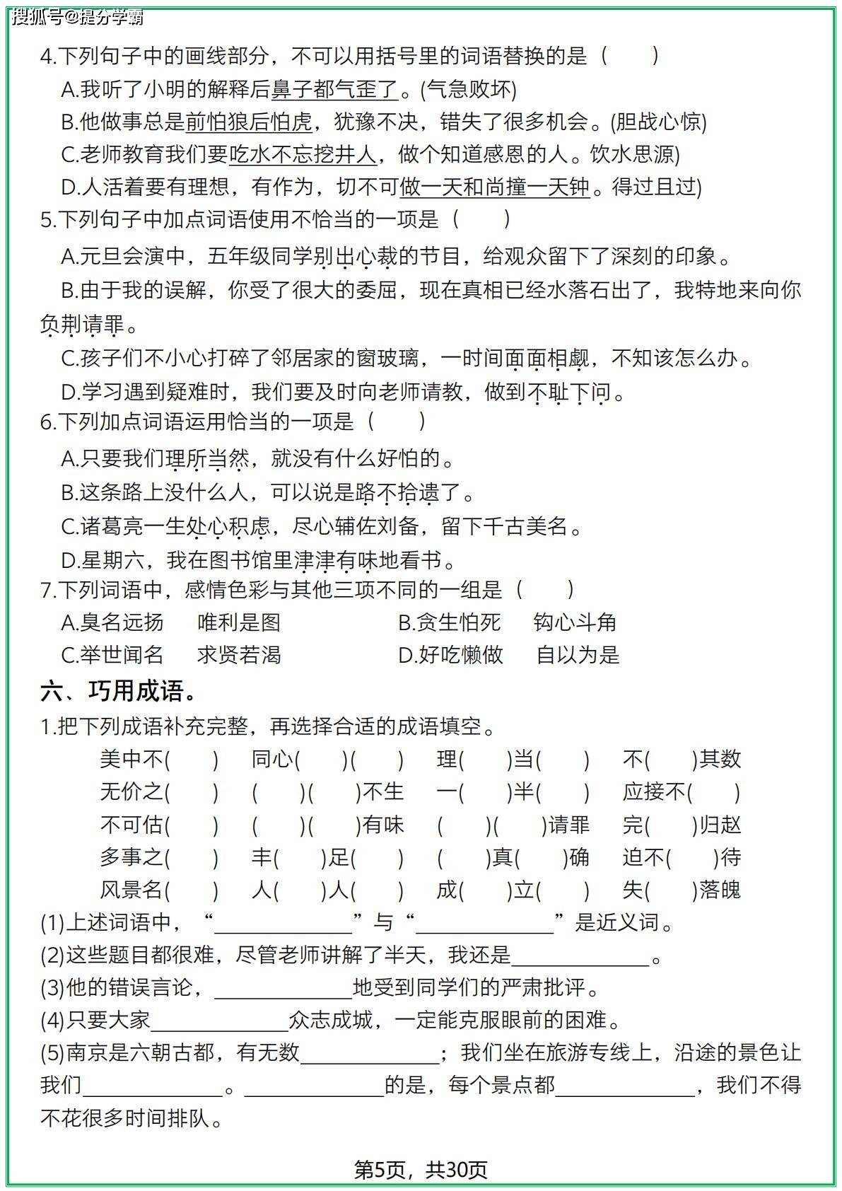 今天为大家分享:五上语文·历年期末常考真题综合小测-30页,当前展示的是字词专项与句子相关练习,内容涵盖语文基础核心模块:字词部分包含看拼音写词语、字形辨析、查字典、字词义理解、词语替换与运用、成语补充及应用等题型,聚焦课本字词的音形义与实际运用;句子部分涉及仿写、句式改写(缩句、陈述句、双重否定句、转述句)、病句修改、句子描写方法与说明方法的判断等,训练句子的规范表达与技巧运用。
