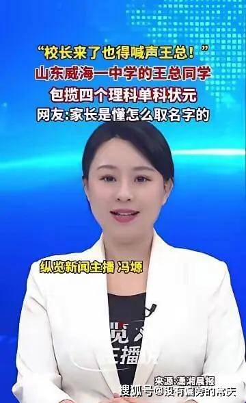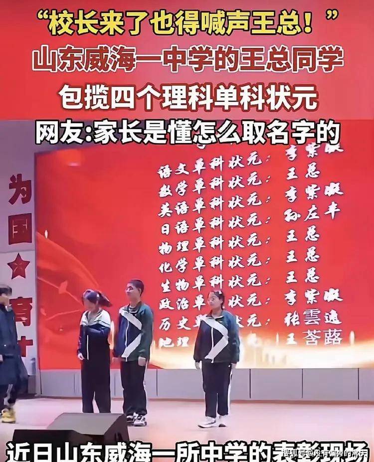近日,山东威海一中学在表彰大会上,校长为获奖的同学颁奖。其中一名男生分别获得了数学,物理,化学,生物4科单科状元,而他的名字去特别引人注目。连校长都得叫他一声王总,他的名字就叫“王总”。
