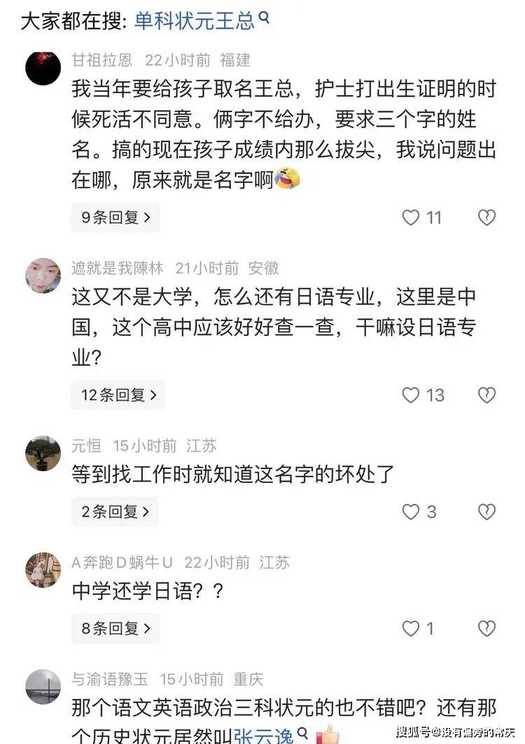 针对此事,有网友表示,我当年要给孩子取名王总,护士打出生证明的时候死活不同意。俩字不给办,要求三个字的姓名。搞的现在孩子成绩内那么拔尖,我说问题出在哪,原来就是名字啊。有网友评论,那个语文英语政治三科状元的也不错吧?还有那个历史状元居然叫张云逸。有网友认为,多课第一,证明他来错学校了,凤凰落在鸡窝里。大多数好学校,高分段堆积,总分排名前面的同学,未必能进入单科排行榜。也有网友担忧,等到找工作就知道这个名字的坏处了。