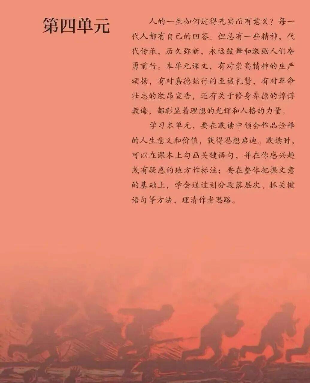 人的一生如何过得充实而有意义?每一代人都有自己的回答。但总有一些精神,代代传承,历久弥新,永远鼓舞和激励人们奋勇前行。本单元课文,有对崇高精神的庄严颂扬,有对嘉德懿行的至诚礼赞,有对革命壮志的激昂宣告,还有关于修身养德的谆谆教诲,都彰显着理想的光辉和人格的力量。