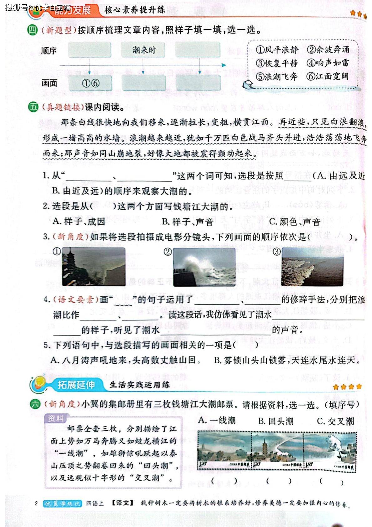今天为大家分享:这份四年级上册语文练习资料,以 “素养导向的大单元作业” 为核心,内容紧扣课本 8 个单元的主题与课文:每个单元对应单课练习、单元要素阅读、语文园地、知识盘点及作文指导,覆盖《观潮》《走月亮》等课文的基础巩固,同时设置 “基础运用”“能力发展”“拓展延伸” 三层练习;还配套单元学业质量评价,整合单元知识进行综合检测,部分单元加入新情境、新题型的实践类题目。