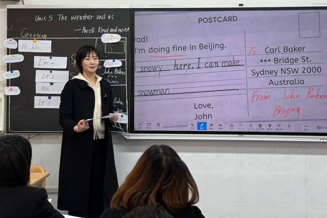 贺琳琳老师与李奕璇老师则围绕人教版四年级上册Unit5 The weather and us,part B Read and write进行微型课同课异构展示,贺老师通过“天气导入-明信片认知-阅读探究”环环相扣的问题链推进,将文本结构进行拆解,有效衔接主题与文本,突破语篇输出难点。