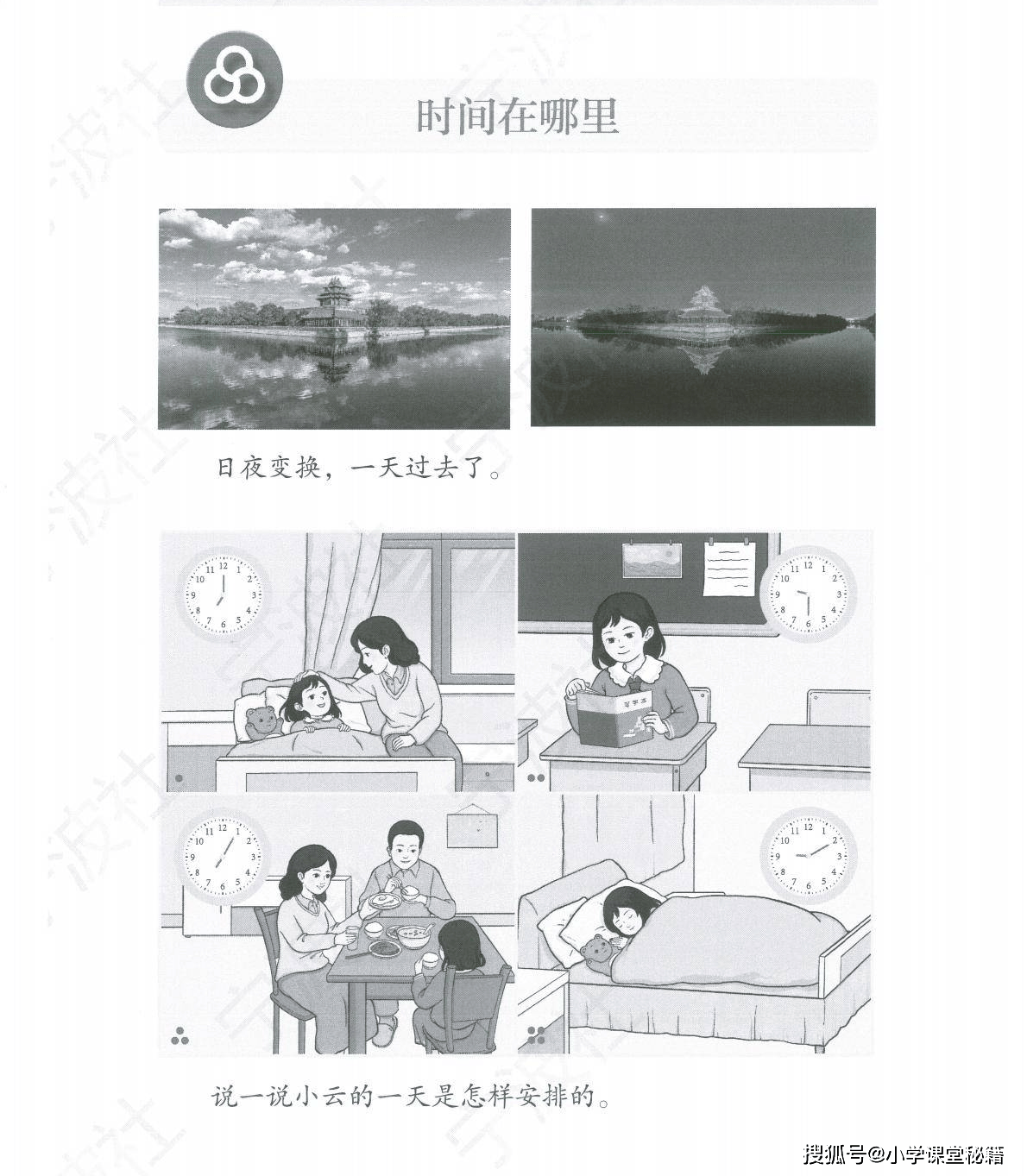 教材开篇的 “时间在哪里”,用一张 “小云的日常作息图” 撕开了数学的 “课本外壳”。图里的闹钟指向 7 点(起床)、12 点半(吃饭)、9 点(睡觉),孩子要做的不是 “背时间单位”,而是 “说说小云的一天怎么安排”。
