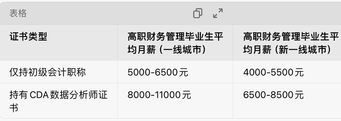结合权威招聘平台2025年财会与数据岗位薪资调研数据,持有CDA数据分析师证书的高职财务管理毕业生,薪资明显高于仅持传统财会证书的同龄人,具体对比见下表: