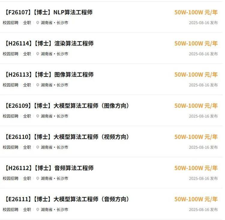 12月18日,该公司招聘官网上也有“应届生年薪百万”标识。记者检索发现,今年8月以来,该公司在长沙陆续发布职位共110个,月薪均在1万以上,其中8个岗位标注“50W-100W/年”,均要求博士。其他岗位大部分要求本科以上。