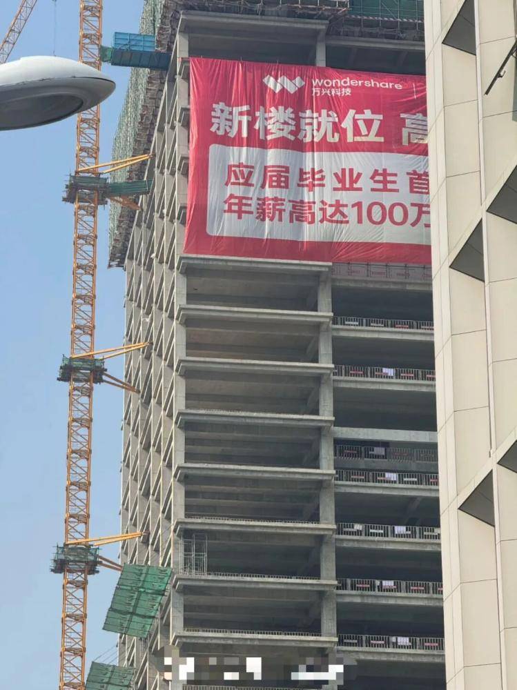 12月16日,长沙岳麓区一网友发视频,称上班时窗外一看,发现一在建楼栋上的巨幅招聘广告:“新楼就位,高薪等您,应届生首年年薪高达100万。”