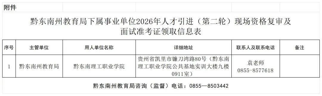 附件:黔东南州教育局下属事业单位2026年人才引进(第二轮)现场资格复审及面试准考证领取信息表