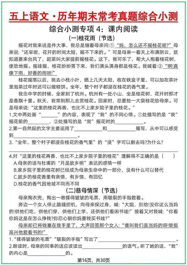 期末备考的核心的是提升答题思维,而非机械刷题。这份五上语文《历年期末常考真题综合小测 - 30 页电子版》,打破传统刷题模式,以真题为载体,聚焦学科核心素养培养。