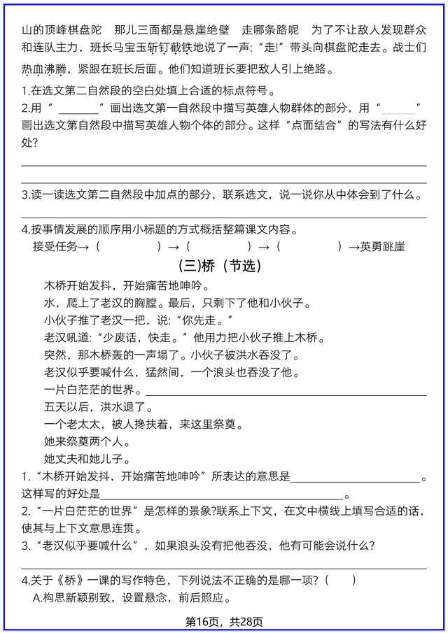 专为六上学生定制的《历年期末常考真题综合小测》(28页电子版)重磅推出,深度梳理近5年各地六上语文期末真题,精准萃取字词辨析、病句修改、阅读理解(记叙文/说明文)、古诗文默写与赏析、习作提纲设计等八大核心常考模块。28页内容摒弃冗余题型,聚焦真题高频考点与典型变式,每道习题均标注考查频次与对应教材知识点,实现“以题带点、精准复盘”。