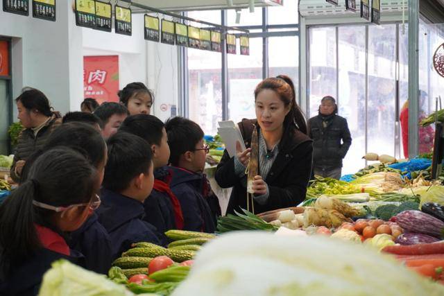 图为浦汇小学的学生们在老师的带领下到菜市场识菜买菜