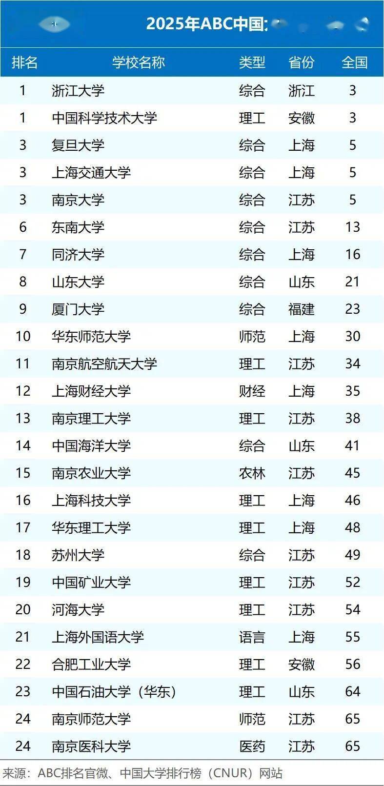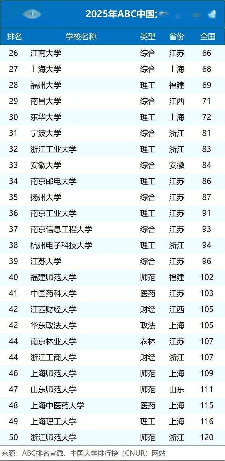 今天,来看看2025年我国华东地区大学排名50强,以ABC排名发布的榜单为参考。