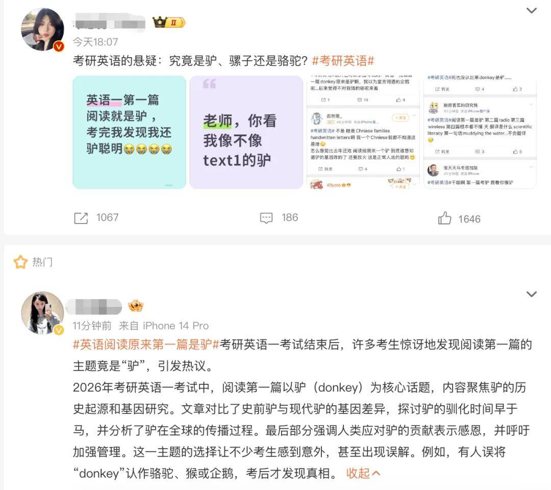 还有英语阅读第一篇嫌疑好像揭晓了,英语阅读原来第一篇是驴,不会知道各位考生都猜对没。
