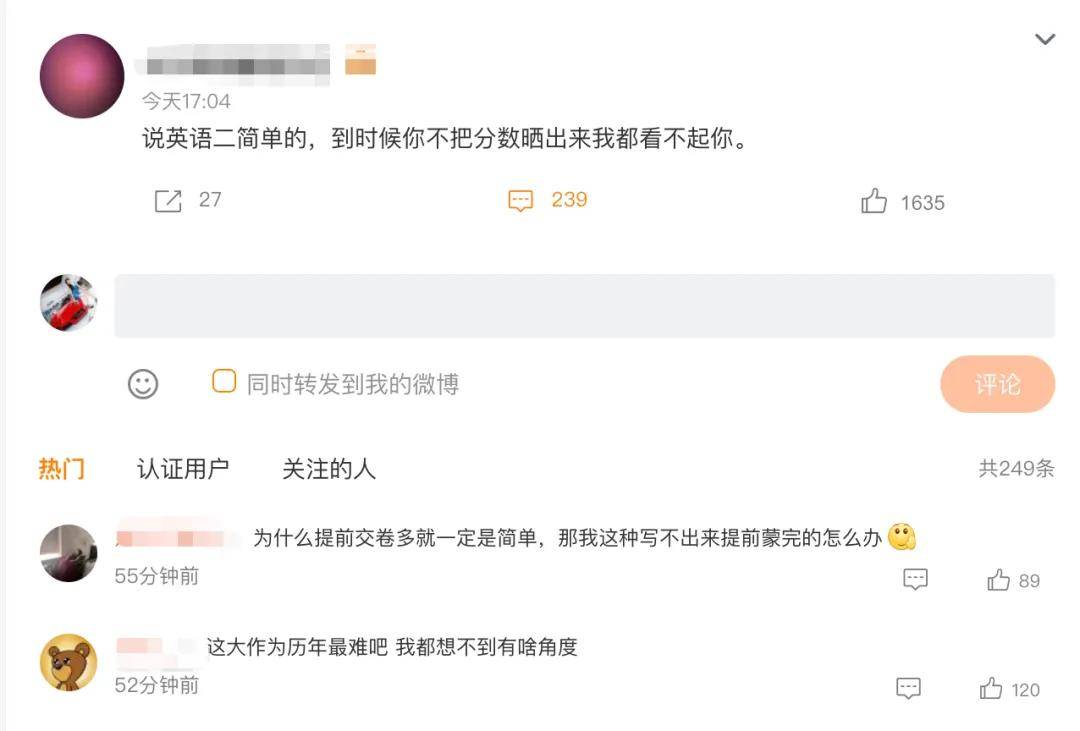 看了不少考英语二学子的评价,有考生表示:说英语二简单的,到时候你不把分数晒出来我都看不起你,还有网友回复写到:这大作为历年最难吧,我都想不到有啥角度。还有网友吐槽英语二阅读难,段落匹配不太好找,还考了人工智能概念。由此可以看出考研英语二恐怕不简单,尤其是大作文和阅读理解估计难度不小,所以说英语二估计不难,或许说简单的人是相对英语一来比较的。