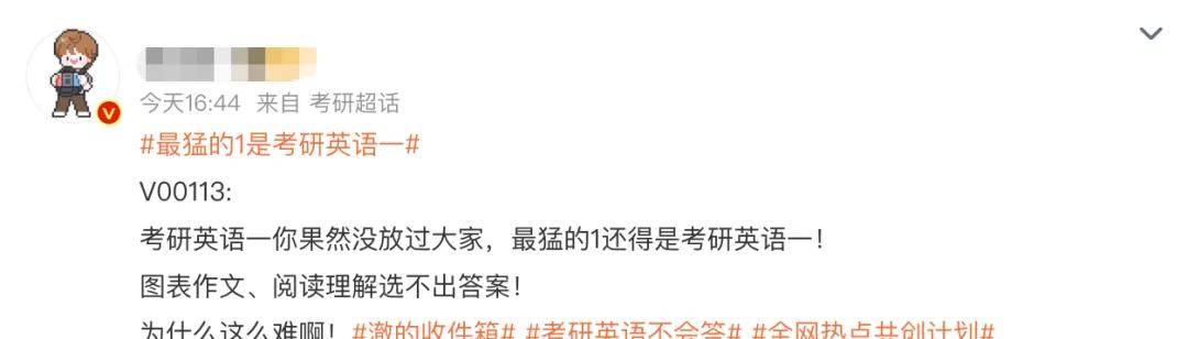 至于考研英语一,难度直接刷屏,好多网友直呼:英语一难,甚至被称为“最猛的1是考研英语一”,比如有网友吐槽“英语一双图表”,表示:看到两个图表的时候心凉了半截,说实话,英语一大作文打破传统图画模式,首次采用双图表分析真得让考生懵了,面对新题型不知道如何下手,还有就是排序题成“重灾区”,逻辑链复杂,很难短时间内理清顺序,另外翻译和阅读理解也让不少考生无从下手。
