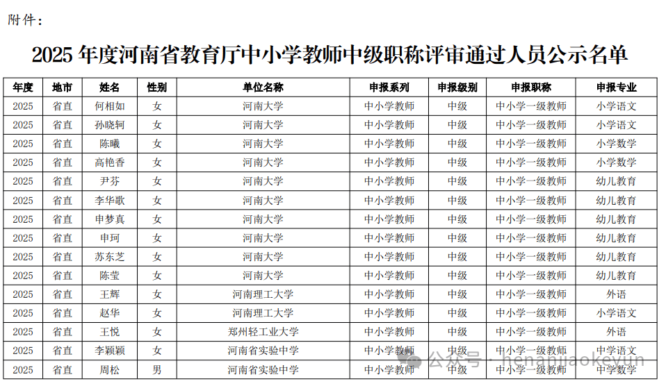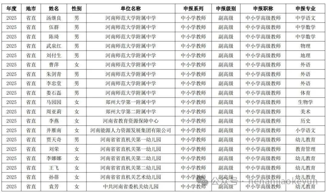 2025年度河南省省直中小学教师副高级职称评审通过人员公示名单
