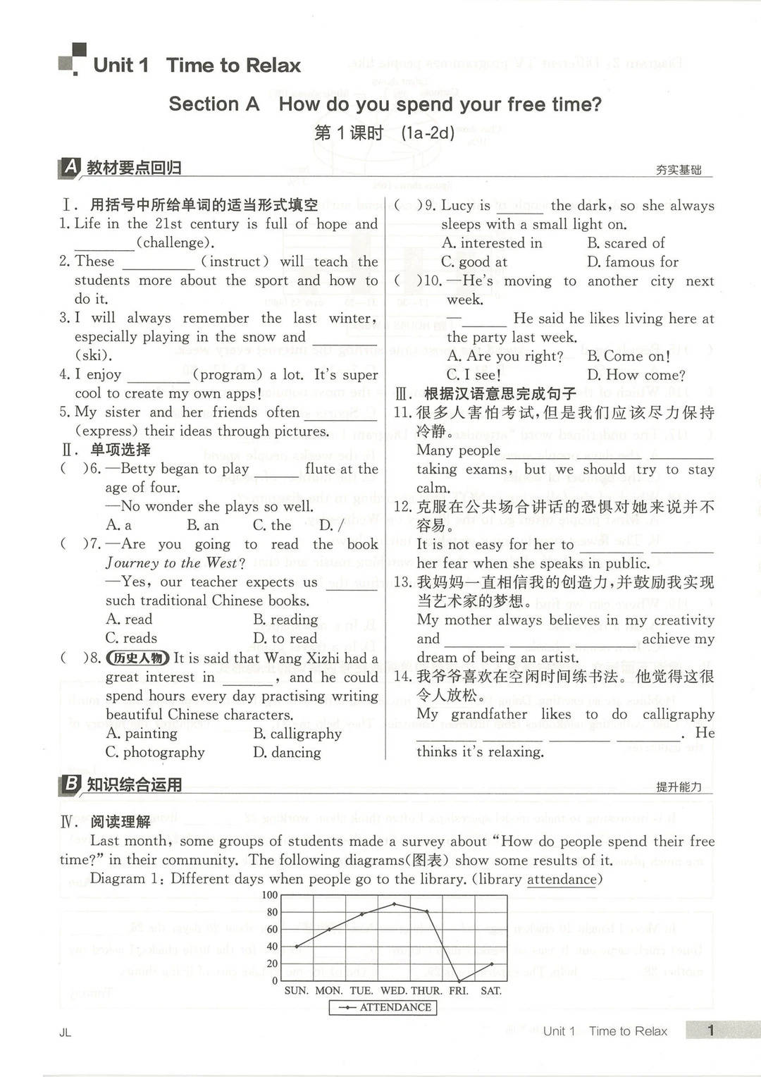首先是帮你把 “课本知识点” 转化为 “实用能力”—— 初二英语开始从 “单句” 转向 “语篇 + 应用”,很多同学会卡在 “知识点会背但不会用”。这份作业本把 “enjoy doing”“help sb. (to) do” 这类短语放进短文填空里练,把 “定冠词 the” 的用法融入单项选择,连图表阅读题都对标中考题型(比如分析 “图书馆 attendance”“不同节目占比”),让你在练题中把知识点用活,刚好契合八年级 “从知识输入到输出” 的能力升级。