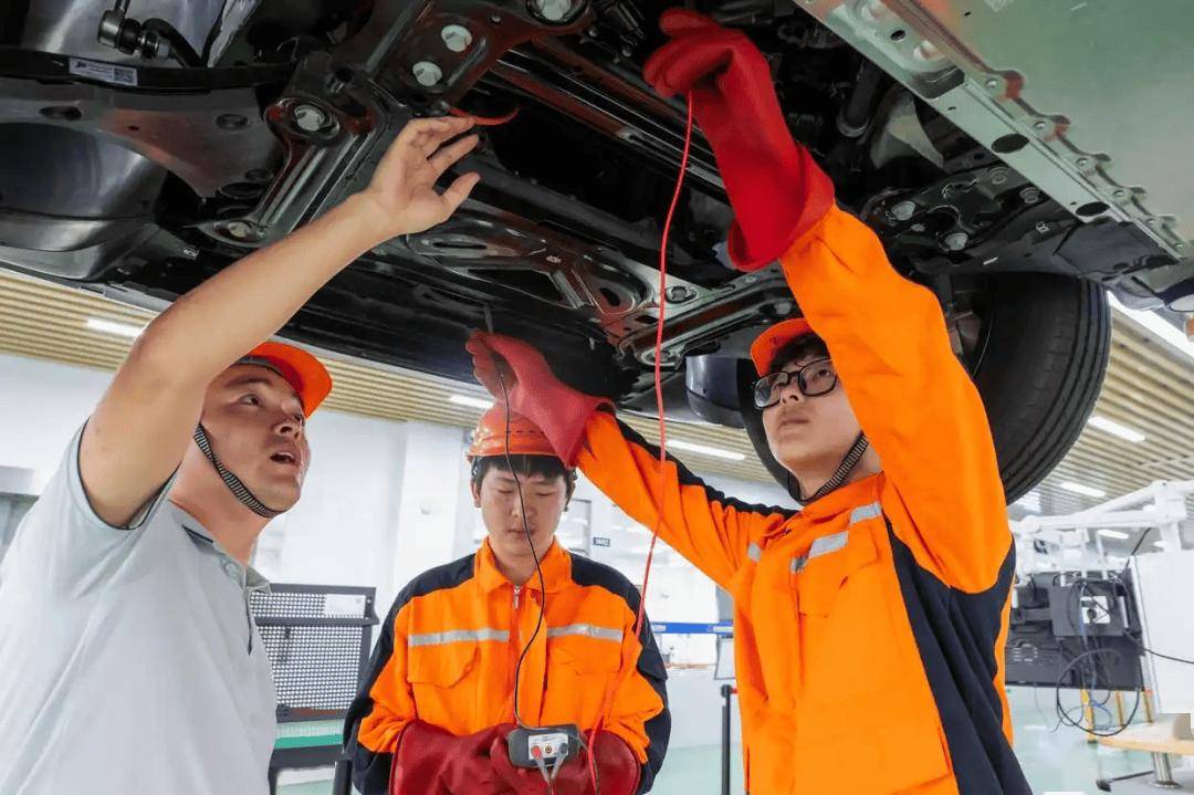 安徽省芜湖市繁昌区芜湖机械工程学校实训基地,学生学习新能源汽车检测与维修知识。肖本祥摄/光明图片